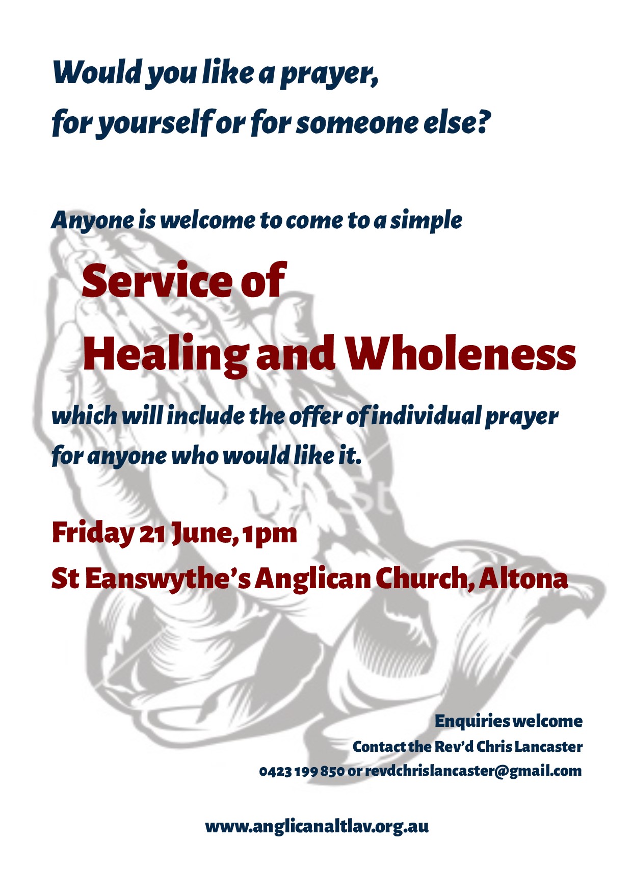 Service of Healing and Wholeness Posted on June 19, 2019 by anglicanaltlav Everyone is welcome this Friday, as we pray for ourselves and those we love: 1pm at St Eanswythe’s. Why not come beforehand and enjoy soup and sandwiches for lunch (from 12pm)? Share this: Click to share on X (Opens in new window) X Click to share on Facebook (Opens in new window) Facebook Like Loading...