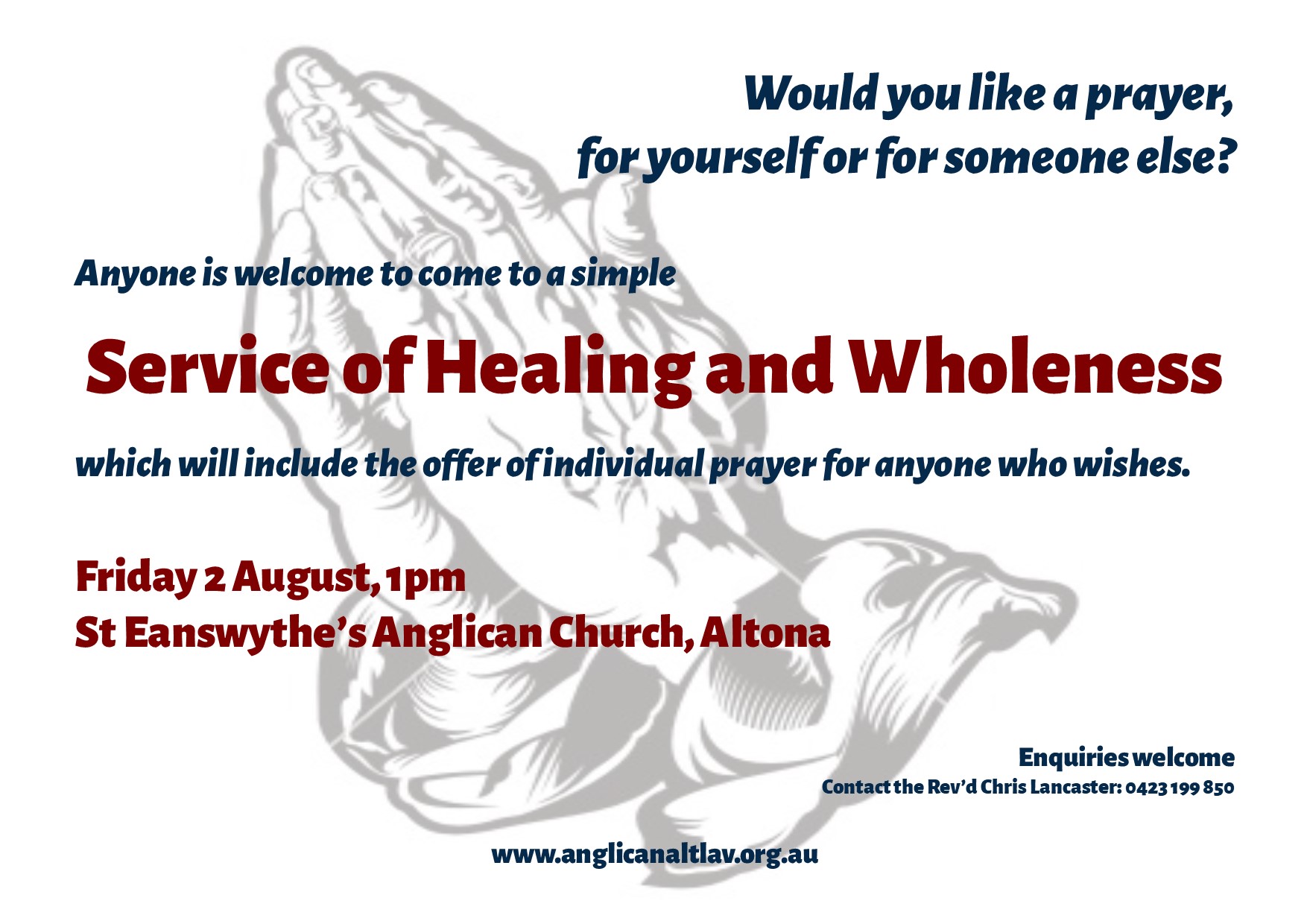 Service of Healing and Wholeness Posted on July 31, 2019 by anglicanaltlav Everyone is welcome this Friday, as we pray for ourselves and those we love: 1pm at St Eanswythe’s. Why not come beforehand and enjoy soup and sandwiches for lunch (from 12pm)? Share this: Click to share on X (Opens in new window) X Click to share on Facebook (Opens in new window) Facebook Like Loading...
