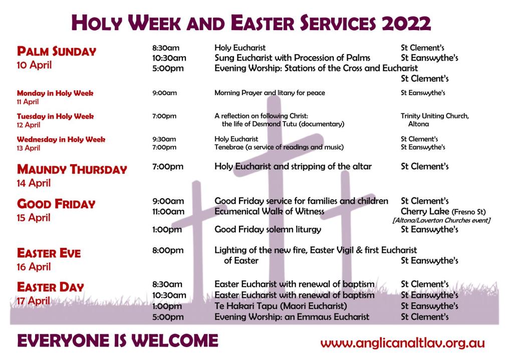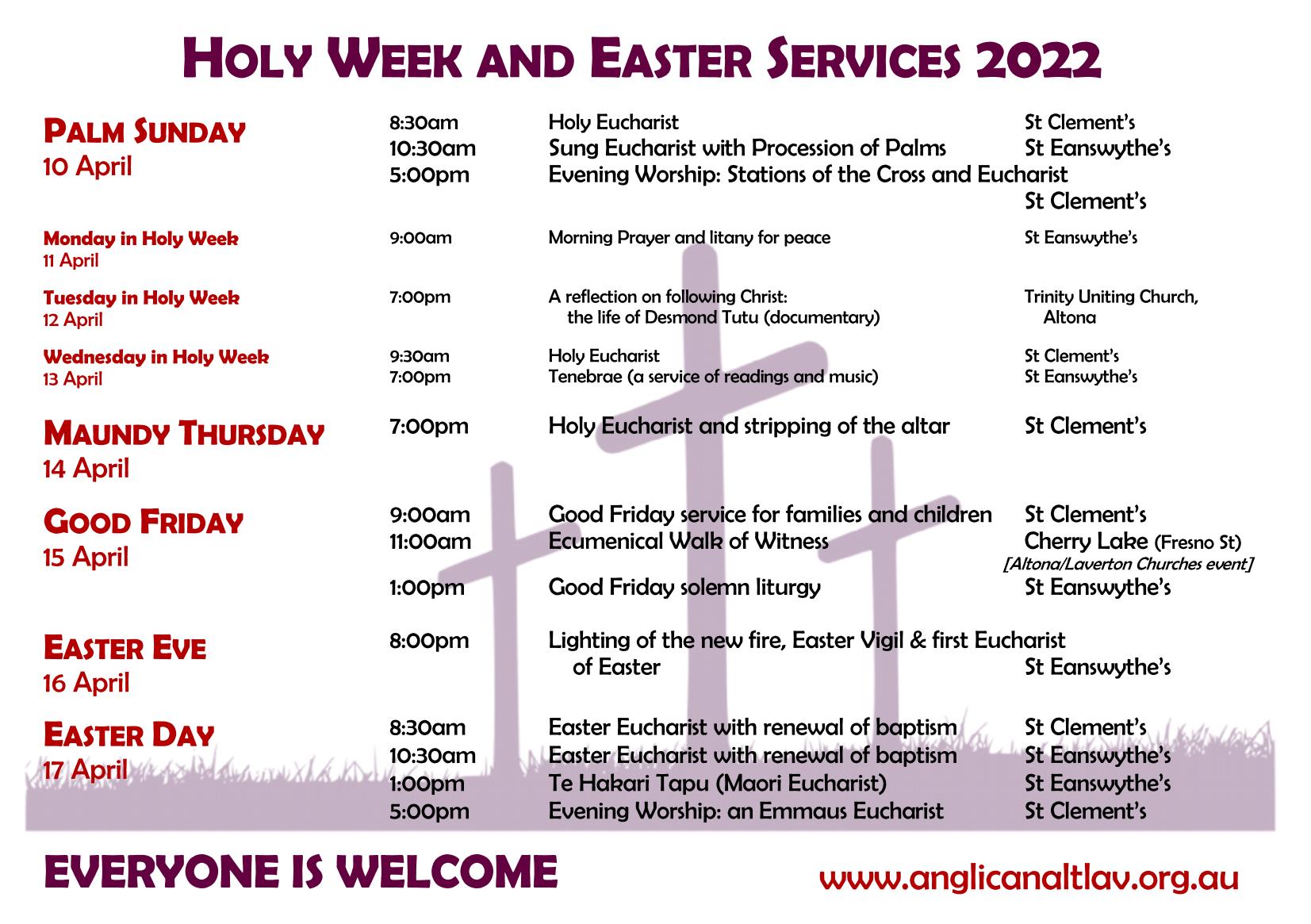 Holy Week and Easter services 2022 Posted on March 26, 2022 by anglicanaltlav Everyone is welcome to join us as we remember the death and resurrection of Jesus, especially in the dramatic liturgies of Palm Sunday, Maundy Thursday, Good Friday and the Easter Vigil. Like Loading...