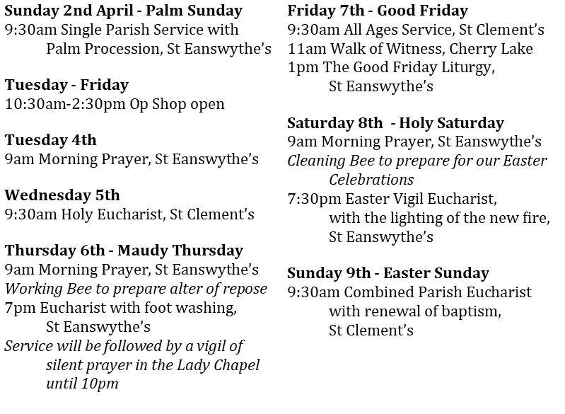 Holy Week in our parish: 2nd April 2023 Posted on March 27, 2023 by anglicanaltlav Share this: Click to share on X (Opens in new window) X Click to share on Facebook (Opens in new window) Facebook Like Loading...